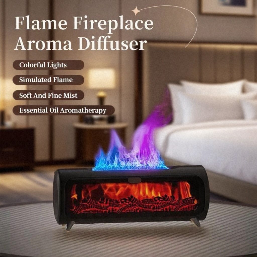 Experience the calming beauty of a modern fireplace with this flame-effect ultrasonic diffuser. Its wide panoramic design creates a vivid ember-like glow that instantly adds warmth and charm to your space. Beneath the flame effect, high-frequency ultrasonic technology transforms water into a fine mist that helps combat dry air while delivering a soft, soothing aroma throughout your room.