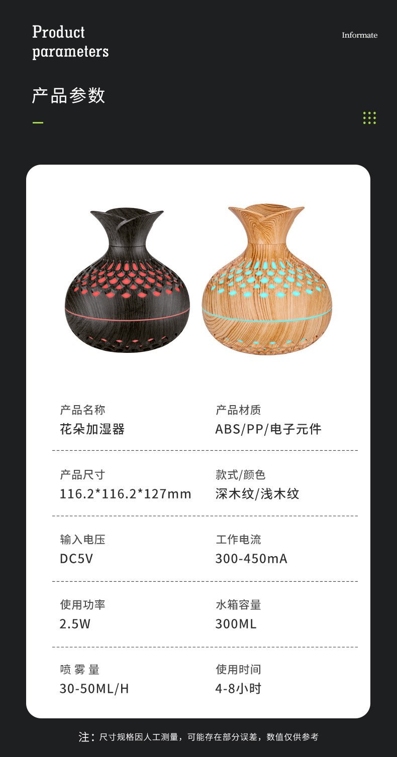 Safety is at the heart of its design. The diffuser automatically shuts off when water is low, protecting both the device and your peace of mind. Made from durable, injection-molded plastic, it offers long-lasting reliability while maintaining a stylish aesthetic available in both light and dark wood finishes. Perfect for anyone seeking an easy, elegant way to enhance their environment with natural aroma.