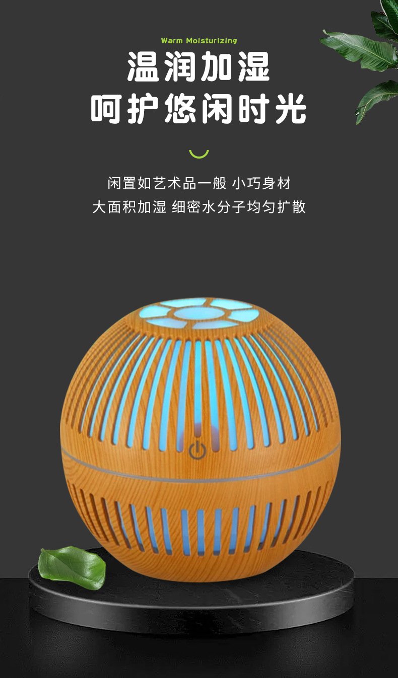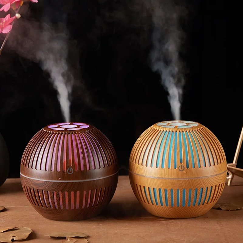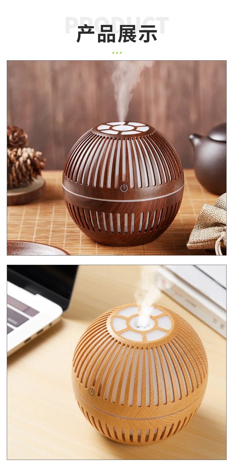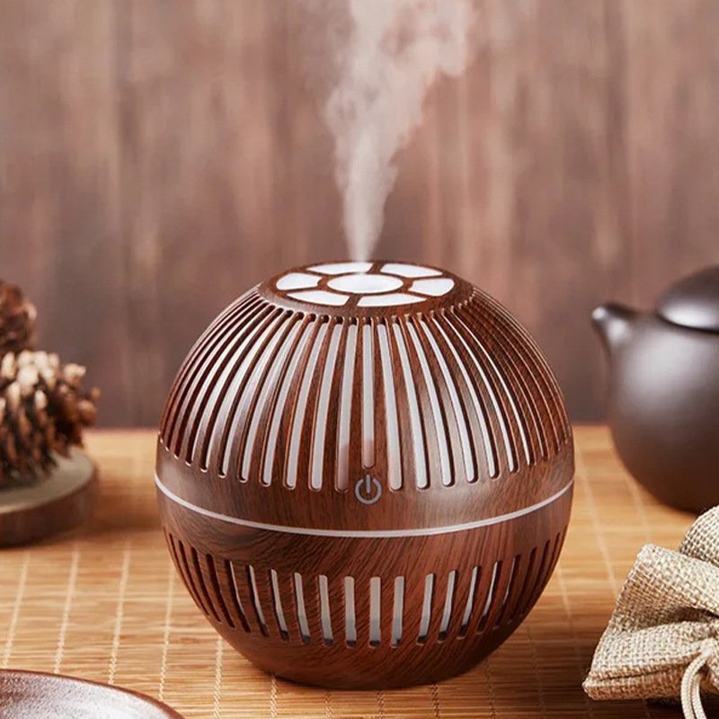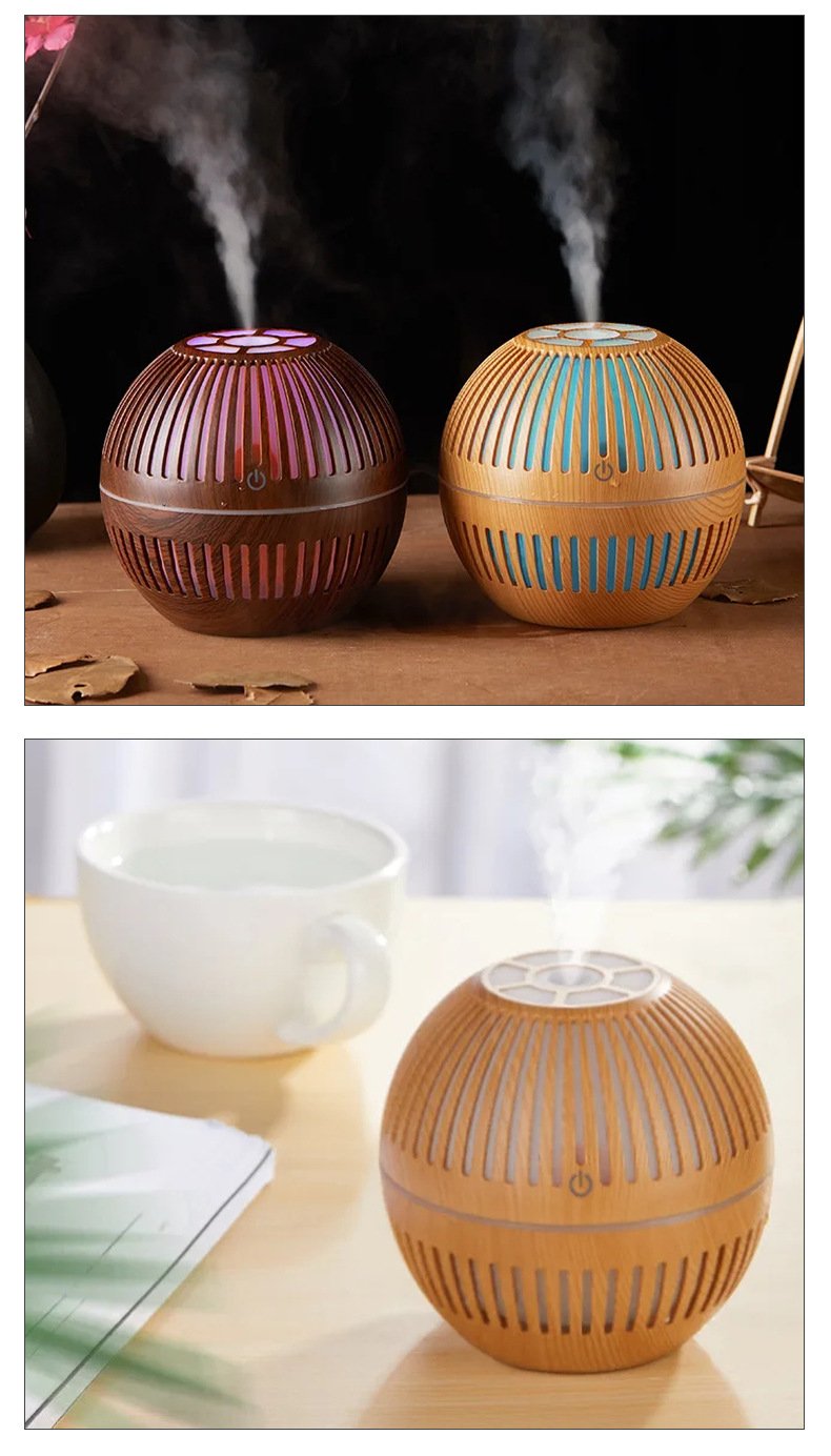 This spherical wood-grain aroma diffuser uses high-frequency ultrasonic atomization to release a soft, refreshing mist that helps improve air comfort in smaller spaces. With its breathable lattice design and warm LED glow, it adds a relaxing ambiance to any room while gently distributing your favorite essential oils. The fine mist particles spread evenly without creating moisture buildup, making it perfect for bedside tables, desktops, and cozy corners.