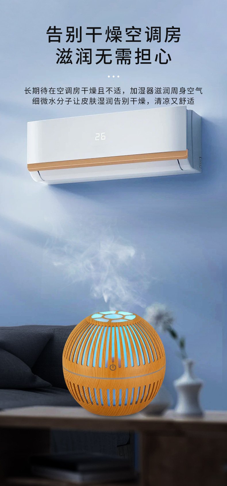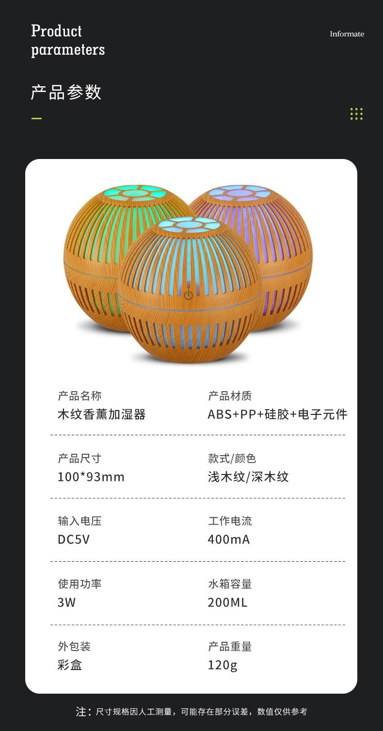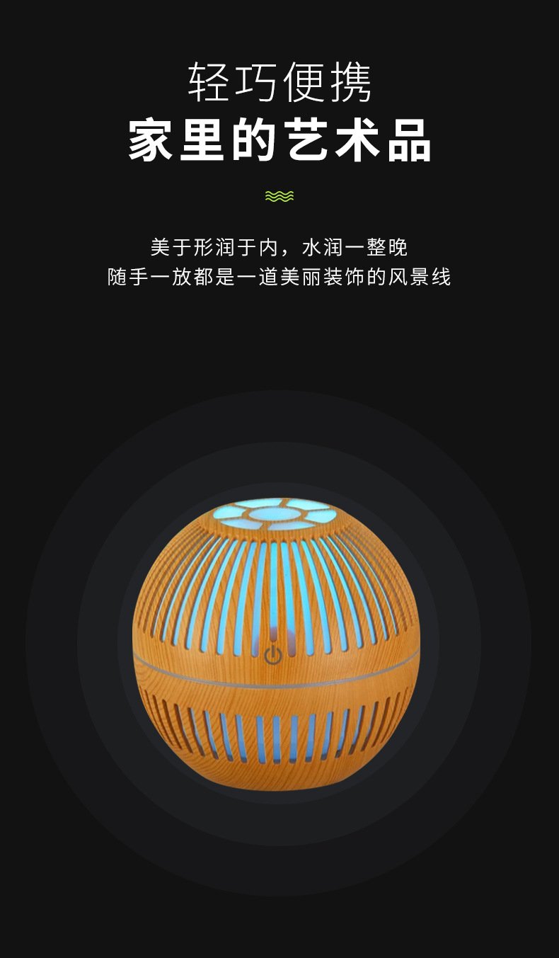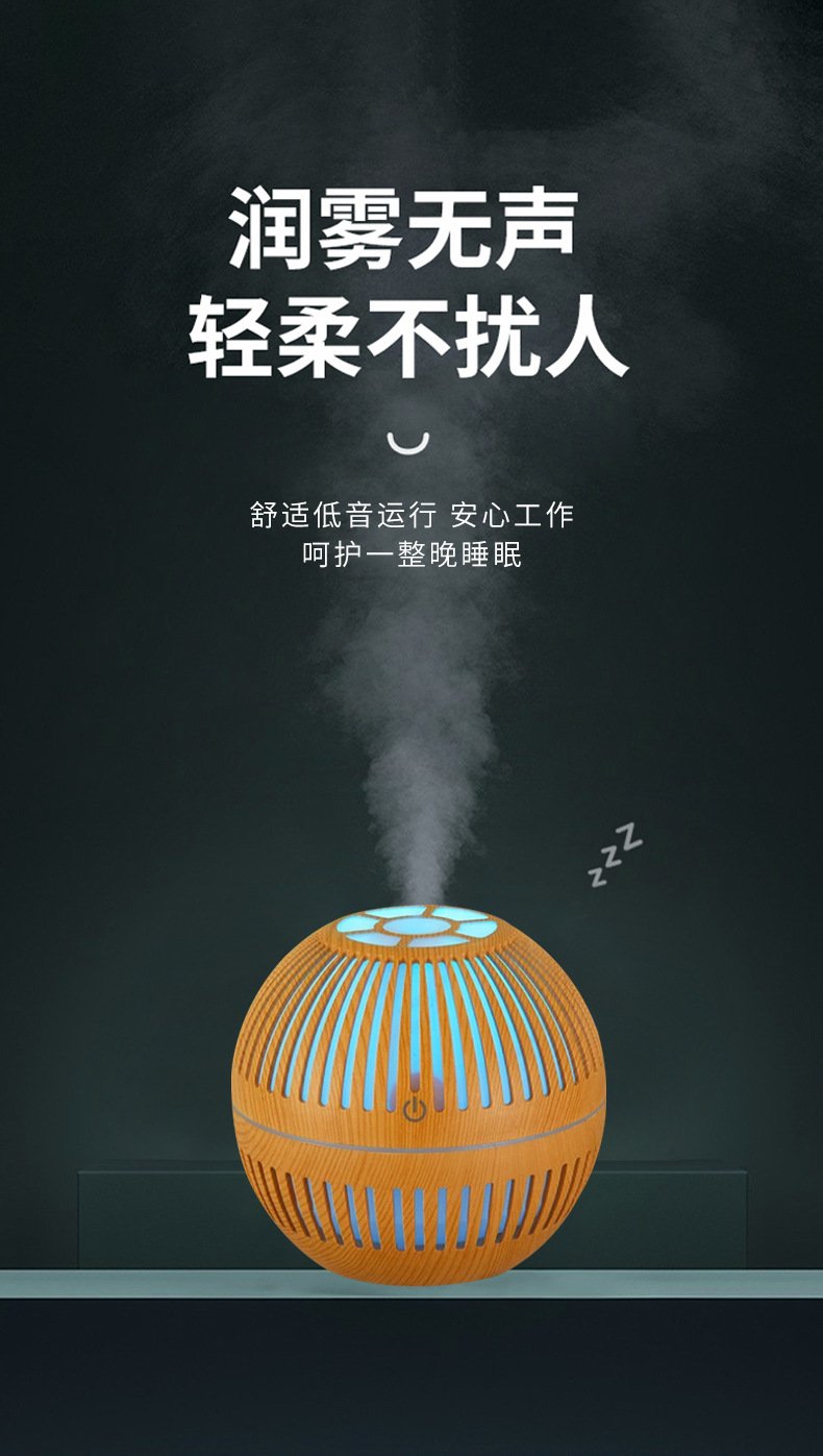 This spherical wood-grain aroma diffuser uses high-frequency ultrasonic atomization to release a soft, refreshing mist that helps improve air comfort in smaller spaces. With its breathable lattice design and warm LED glow, it adds a relaxing ambiance to any room while gently distributing your favorite essential oils. The fine mist particles spread evenly without creating moisture buildup, making it perfect for bedside tables, desktops, and cozy corners.